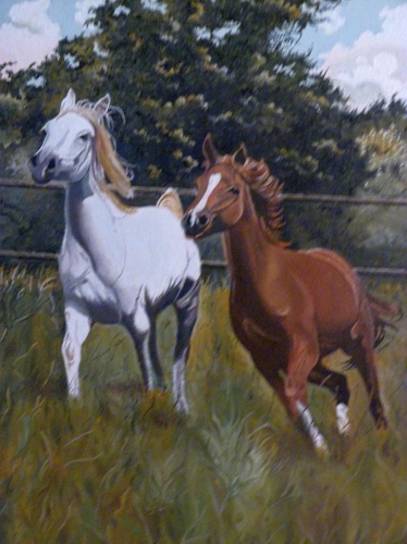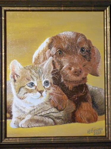 Harald ist ein Hobbymaler, der in der schönsten Tradition der englischen Porträt- , Tier- und Landschaftsmaler seine Motive lebensecht in Öl auf der Leinwand festhält. Er ist weit über die Grenzen seiner Heimatstadt, in deren Rathaus ein großes Bild des amtierenden Eulenspiegel hängt, bekannt. Unsere Töchter lieben insbesondere seine Tierbilder sehr, da sie ja Tiere abbilden, die sie selber kennen oder gekannt haben. Sie hatten ein Foto unserer Lieblinge dort abgegeben und jetzt haben wir ein prächtiges Ölbild unserer Hunde, das wir in unserer Ferienwohnung aufhängen werden.